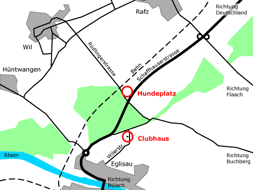 Der Übungsplatz unseres Vereins liegt weit ausserhalb der Rafzerfelder Gemeinden, im Kiesgruben-Gebiet. Ein grosser Vorteil, weder Autos noch Hundegebell stören jemanden. Obwohl abgelegen, ist er gut zu finden. Direkt an der Umfahrungsstrasse (Schaffhauserstrasse) zwischen Eglisau und Rafz. Das Pachtland gehört dem Kanton Zürich. Der Pachtvertrag besteht seit über 30 Jahren. Der Platz darf ausschliesslich von Vereinsmitgliedern und Kursteilnehmern benutzt werden. Platzwart: René Schweizer 079 214 72 86.